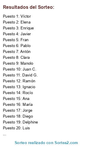 Lista de participantes: Alba, Ana, Antón, Carlos, Clara, David A., David G., Delphine, Diego, Elena, Enrique, Fran, Ignacio, Iván, Javier, Jesús, Jorge, Candolo, Juan C., Luis, Manolo, María, Mario, Mónica, Nati, Pablo, Ramón, Rocío, Silvia, Víctor.