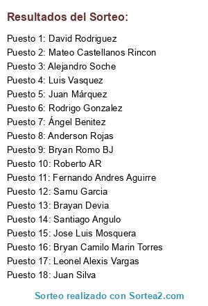 Lista de participantes: Leonel Alexis Vargas, Juan Márquez, Juan Silva, Brayan Devia, Jose Luis Mosquera, Roberto AR, Fernando Andres Aguirre, Ángel Benitez, David Rodriguez, Bryan Romo BJ, Santiago Angulo, Alejandro Soche, Luis Vasquez, Mateo Castellanos Rincon, Samu Garcia, Anderson Rojas, Rodrigo Gonzalez, Bryan Camilo Marin Torres.