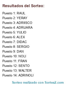 Lista de participantes: RAUL, SENTO, YULIO, NOLI, ADRINOLI, ADRIISCO, ADRIJARA, DIDAC, WALTER, YERAY, ALEX, FRAN, DAN, SERGIO.