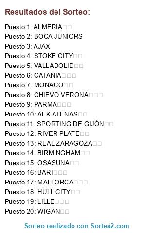 Lista de participantes: WIGAN , LILLE , SPORTING DE GIJÓN , STOKE CITY , BIRMINGHAM , CATANIA , RIVER PLATE , REAL ZARAGOZA , OSASUNA , BOCA JUNIORS, ALMERIA , CHIEVO VERONA , MONACO , MALLORCA , VALLADOLID , PARMA , AEK ATENAS , BARI , HULL CITY , AJAX.