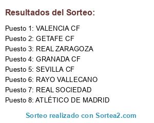 Lista de participantes: VALENCIA CF, ATLÉTICO DE MADRID, SEVILLA CF, RAYO VALLECANO, GRANADA CF, GETAFE CF, REAL ZARAGOZA, REAL SOCIEDAD.