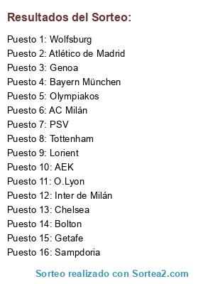 Lista de participantes: AC Milán, Inter de Milán, Sunderland, Lokomotiv, Rubin Kazan, Palermo, Fiorentina, FC Köln, Lorient, Lazio, CSKA Moskva, West Ham, PSV, Villarreal, Sporting, Manchester City.