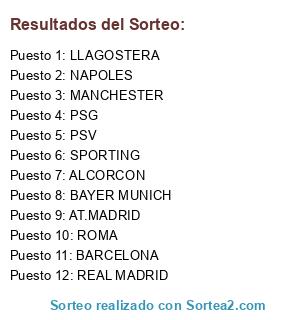Lista de participantes: SPORTING, AT.MADRID, PSG, ROMA, MANCHESTER, BARCELONA, NAPOLES, ALCORCON, PSV, BAYER MUNICH, REAL MADRID, LLAGOSTERA.