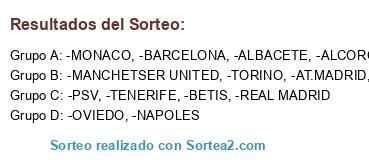 Lista de participantes: -BETIS, -NAPOLES, -AT.MADRID, -ALBACETE, -MONACO, -REAL MADRID, -MANCHETSER UNITED, -ALCORCON, -PSV, -ROMA, -BARCELONA, -TENERIFE, -TORINO, -OVIEDO.