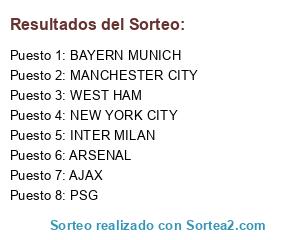 Lista de participantes: PSG, AJAX, ARSENAL, NEW YORK CITY, WEST HAM, INTER MILAN, MANCHESTER CITY, BAYERN MUNICH.