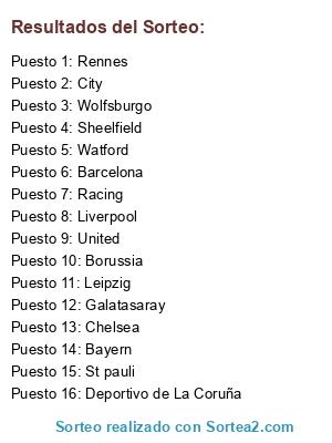 Lista de participantes: Ajax, Borussia, Celtic, Malaga, Psg, Deportivo de La Coruña, Zaragoza, Sevilla, Valencia, Watford, Milán, Bayern, Barcelona, St pauli, Liverpool, Forest, Marsella, Parma, Betis, Real Madrid, Chongquing, Osasuna, Galatasaray, Levante, City, Racing, Rennes, Hotspurs, Las palmas, Unión española, Arsenal, Chelsea, Marítimo, Crystal palace, United, Leipzig, Español, Sheelfield, Wolfsburgo, Villarreal.