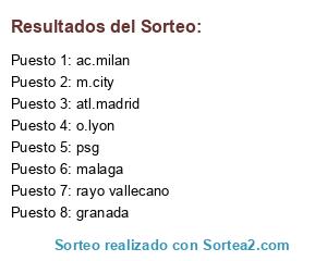 Lista de participantes: rayo vallecano, o.lyon, psg, m.city, malaga, atl.madrid, granada, ac.milan.