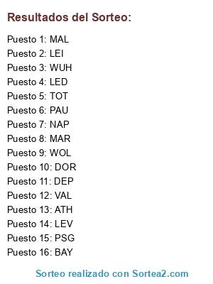 Lista de participantes: VAL, LEV, DOR, MAR, BAY, PSG, WUH, PAU, TOT, WOL, DEP, MAL, LEI, LED, NAP, ATH.