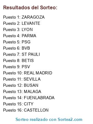 Lista de participantes: LYON, LEVANTE, BVB, PSV, CITY, BUSAN, CASTELLON, SEVILLA, ZARAGOZA, ST PAULI, MALAGA, FUENLABRADA, PARMA, PSG, BETIS, REAL MADRID.