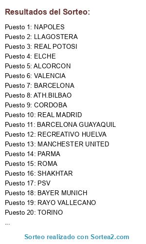 Lista de participantes: AT.MADRID, ROMA, BARCELONA, NAPOLES, MANCHESTER UNITED, BAYER MUNICH, REAL MADRID, PSG, ALCORCON, PSV, SHAKHTAR, LLAGOSTERA, TORINO, CORDOBA, BARCELONA GUAYAQUIL, VALENCIA, MILAN, ATH.BILBAO, REAL POTOSI, BOCA JUNIORS, RECREATIVO HUELVA, ELCHE, PARMA, RAYO VALLECANO.