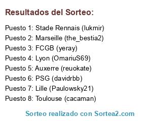 Lista de participantes: Auxerre (reuokate), FCGB (yeray), Lille (Paulowsky21), Lyon (OmariuS69), Marseille (the_bestia2), PSG (davidrbb), Stade Rennais (lukmir), Toulouse (cacaman).