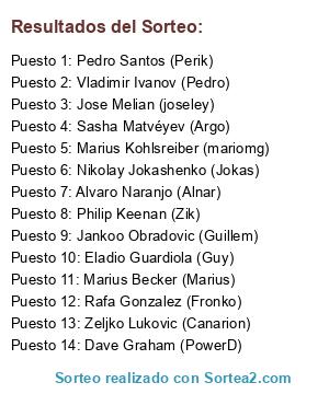Lista de participantes: Sasha Matvéyev (Argo), Jose Melian (joseley), Eladio Guardiola (Guy), Philip Keenan (Zik), Nikolay Jokashenko (Jokas), Vladimir Ivanov (Pedro), Marius Becker (Marius), Jankoo Obradovic (Guillem), Dave Graham (PowerD), Zeljko Lukovic (Canarion), Marius Kohlsreiber (mariomg), Alvaro Naranjo (Alnar), Rafa Gonzalez (Fronko), Pedro Santos (Perik).