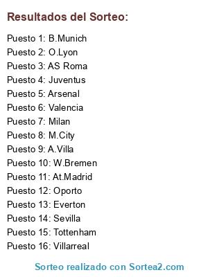 Lista de participantes: W.Bremen, M.City, Valencia, AS Roma, A.Villa, O.Lyon, Tottenham, Everton, Arsenal, Oporto, Milan, Villarreal, Sevilla, At.Madrid, B.Munich, Juventus.