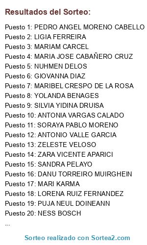 Lista de participantes: SILVIA YIDINA DRUISA(3 participaciones), LORENA RUIZ FERNANDEZ(3 participaciones), MARIBEL CRESPO DE LA ROSA(3 participaciones), NESS BOSCH(3 participaciones), MIMES DE AZZARIA(3 participaciones), ITXASO ERRO(3 participaciones), HARWE TUILEVA PRIMAVERA(3 participaciones), AYRA ALSERET(3 participaciones), MARIAM CARCEL(3 participaciones), MARI KARMA(3 participaciones), MARIA ANGELES LOPEZ HERNANDEZ(3 participaciones), JORGE ELEAZAR BDILLO GUTIERREZ(3 participaciones), MARI FE PIÑEIRO(3 participaciones), GIOVANNA DIAZ(3 participaciones), NOELIA LAVANDA(3 participaciones), ROSA LAGUNA(3 participaciones), NUHMEN DELOS(3 participaciones), IRENE BARROSO RODRIGUEZ(3 participaciones), ANTONIA VARGAS CALADO(3 participaciones), JULIE JULY LUNA(3 participaciones), DANU TORREIRO MUIRGHEIN(3 participaciones), NAIARA SASIAIN(3 participaciones), LIGIA FERREIRA(3 participaciones), MADA MALAVE(3 participaciones), ANTONIO VALLE GARCIA(3 participaciones), EMILIO DAVID GOMEZ CRESPO(3 participaciones), SORAYA PABLO MORENO(3 participaciones), PEDRO ANGEL MORENO CABELLO(3 participaciones), YOLANDA BENAGES(3 participaciones), MARIA JOSE CABAÑERO CRUZ(3 participaciones), EVA AIRLIN MARIA(3 participaciones), PUJA NEUL DOINEANN(3 participaciones), ZELESTE VELOSO(3 participaciones), ARADIA MOON(3 participaciones), SANDRA PELAYO(3 participaciones), ZARA VICENTE APARICI(3 participaciones).