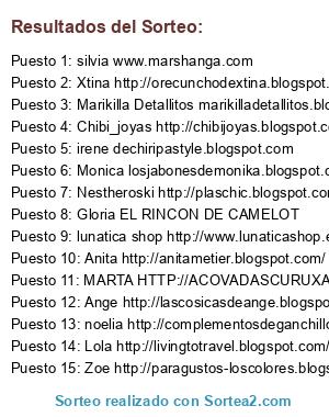 Lista de participantes: Zoe http://paragustos-loscolores.blogspot.com/, noelia http://complementosdeganchillo.blogspot.com/, Xtina http://orecunchodextina.blogspot.com/, Gloria EL RINCON DE CAMELOT, MARTA HTTP://ACOVADASCURUXAS.BLOGSPOT.COM, Monica losjabonesdemonika.blogspot.com, Marikilla Detallitos marikilladetallitos.blogspot.com, Chibi_joyas http://chibijoyas.blogspot.com/, silvia www.marshanga.com, irene dechiripastyle.blogspot.com, Nestheroski http://plaschic.blogspot.com/p/concursos.html, Lola http://livingtotravel.blogspot.com/, Ange http://lascosicasdeange.blogspot.com/, Anita http://anitametier.blogspot.com/, lunatica shop http://www.lunaticashop.es/.