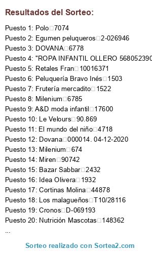 Lista de participantes: Tuttotempo 2001222, Idea olivera Tc/8398, ROPA INFANTIL OLLERO 10016312, Idea Olivera C/2752, Dovana 2257, El principito 4614, LUNA 2-026886, Patricia Mendo 437, TUTTO TEMPO 2001223, Eva Reyes moda y complementos 299, Retales fran 6648, Patricia Mendo 438, Idea olivera 530001, ROPA INFANTIL OLLERO 10016313, PATRICIA MENDO 439, LUNA 2-026887, LUNA 2-026888, Idea olivera C2754, Patricia mendo 440, Luna 2-026889, Retales Fran 6652, Le Velours 1260, Juguetería irene 148325, IDEA OLIVERA TC/8406, Aguja de oro 15465, Le Velours 285, Luna 2-026890, Carlos joyeros 978, Irene Juguetes y Regalos (04-12-2020) 5, ROPA INFANTIL OLLERO 10016314, Ana floristería 3973, Cortinas molina 6997, Nutrición Mascota 74728, ROPA INFANTIL OLLERO 10016315, Idea olivera C/2756, Luna 2-026891, Flichi shop 1157, Juguetería Irene 000007/04-12-2020, Luna 2-026892, ROPA INFANTIL OLLERO 10016316, Luna 2-026893, Coquetos 2-002652, Coquetos 2-002651, ROPA INFANTIL OLLERO 10016317, Coquetos 2-002650, Patricia Mendo 441, Nutrición Mascota C.I.F. 6995930C, Retales Fran 6650, Patricia Mendi 442, Librería El Principito 4617, Librería El Principito 4616, Zapatos MC 885, Nutrición Mascota 74725, Sabbar Atman 3, Colorín colorado 2722, ROPA INFANTIL OLLERO 10016319, Sensación digital 1504, Le Velours 1262, Merceria y lenceria labores 90665, Nutrición Mascotas TK\74730, BAZAR SABBAR 10016320, ROPA INFANTIL OLLERO 2-002653, Coquetos T0218, Frutería disfruta 7023, Cortinas Molina 564, Confecciones Aurelio 10016321, ROPA INFANTIL OLLERO 2723, Colorín Colorado 2-002647, Coquetos 2720, Colorin colorado 5680523730, MILENIUM 608, Peluquería Bravo 10016322, "ROPA INFANTIL OLALLA 7029, Cortinas Molina 148329, Juguetería irene 15471, Aguja de oro 1414, Jugueteria pamda 1263, Le Velours T19/4031, Bellafarma 1415, Jugueteria pamda T19/4030, Bellafarma 6638, Retales Fran T19/4029, Bellafarma T19/4028, Bellafarma 2650, Zapatería Abracadabra T19/4027, Bellafarma T19/4025, Bellafarma T19/4026, Bellafarma 2821, Sabbar Atman 2824, Sabbar Atman 2649, ABRACADABRA Zapatería infantil 148324/04/12/2020, Juguetería Irene 4618, Libreria el principito 001/003116, Beep 2264, Dovana T19/4022, Bellafarma 2-026894, Luna 74732, Nutrición Mascotas 49065, Egumen peluqueros 49066, Egumen peluquwros 888, Calzados M.C. 2658, ABRACADABRA zapatería infantil 2267, DOVANA 5680523870, MILENIUM 6635, Retales Fran 2261, Dovana 000014. 04-12-2020, Juguetería Irene 1413, Juguetería Pamda 609, Peluquería Bravo 260748, Deportes Cronos 3560, SPORT FISHING 3562, SPORT FISHING 8.407, Idea Oliveira TC5/82622, Tienda Polo 303, Eva Reyes 304, Eva Reyes TC/ 8417, Idea Olivera 6646, Retales Fran TC 8418, Idea Olivera 3614, Libreros Naroga 2827, Bazar sabbar Atman 7043, Cortinas Molina 3975, Ana floristería 568, Confecciones Aurelio 2.748/C, Electrodomésticos Idea Olivera 305, Eva Reyes TC5/82625, TIENDA POLO Tr/74735, Nutrición mascota S20/000000011837, SENSACION DIGITAL 22550, El mundo del niño 15472, Aguja de oro 569, Confecciones Aurelio 443, Patricia Mendo 307, Eva Reyes 308, Eva Reyes 28056, Teresa Mayo TC5/82626, tienda polo 100116324, "ROPA INFANTIL OLLERO 5680523900, Milenium 610, Peluquería Bravo 4468, Pinturas moncar 444, Patricia Mendo 1417, Juguetería pamda 1418, Juguetería pamda 28054, Teresa Mayo 5680523910, Milenium 2829, Sabbar Atman 1419, Juguetería pamda 74736, Nutrición mascotas 2-002654, Coquetos 000020/04-12-2020, Juguetería Irene T092ac890010000, "Modimel. La 2-026897, LUNA 288, Le Velours 49062, EGUMEN PELUQUEROS Tc5/82627, Tienda POLO 167355, Gandariaa 3617, Librería naroga 6718, Retales Fran 3618, Naroga 8421, Idea olivera 74739, Nutrición Mascotas 3619, Librería Naroga "Tc8422, "Idea olivera M1-T0216, Fruteria disfruta TC8426, Idea olivera 202006023, naroga libreria Tc5/82629, Tienda POLO 2-002656, COQUETOS Tc5/82630, Tienda POLO 202006026, LIBRERIA NAROGA 10016325, "ropa infantil ollero 2660, Zapateria Abracadabra 10001831, INFINITY 10016326, LIBRERÍA NAROGA 10016327, ROPA INFANTIL OLLERO 1265, Le Velours 74745, Nutricion mascotas 2-026898, luna 2-026899, luna TK/74738, nutrición mascotas 72715, Electrocash 72727, Electrocash 72724, Electrocash 2 002728, COLORIN COLORADO 2661, Abracadabra 74746, nutrición mascotas TC 8427, Idea coria TC5/82631, Tienda Polo 2-002657, Coquetos 2-004473, Pinturas Moncar 2-026901, Luna 3574, Sport fishing 7050, CORTINAS MOLINA 1-001266, Levelours 22610, El mundo del niño 1-001267, Le velours 1280, Comercial Pacheco 1281, Comercial Pacheco 1134, La casita de lara 49075, Egumen peluqueros TC5/82632, Tienda polo 446, Patricia Mendo 6698, Retales Fran 6662, Retales Fran 2662, Abracadabra 8429, Idea olivera Tc5/82633, Tienda POLO 2-001506, SENSACION DIGITAL 22609, EL MUNDO DEL NIÑO 28057, Teresa Mayo CRO/260780, DEPORTES CRONOS 10016328, ROPA INFANTIL OLLERO 6726, Retales fran 2-026902, LUNA TC/8425, Idea Olivera T/983, Carlos Joyeros TC/8426, Idea Olivera T/982, Carlos Joyeros 4, Lamparas Isabel 1, Lamparaa Isabel Tc8430, Idea Olivera 2651, Abracadabra 2732, Colorín colorado 2-001507, Sensacion digital 74748, Nutrición mascotas 10016329, ROPA INFANTIL OLLERO 2664, Abracadabra zapateria 74750, Nutrición mascotas 74751, Nutrición mascotas 6746, Retales fran TC5/82628, Tiendas Polo 17560, AyD 3613, Librería naroga 6757, Retales Fran 6988, Cortinas Molina 6641, Retales Fran CRO/260753, Deportes cronos T/979, Carlos Joyeros 1-001276, Comercial Pacheco 138, Ámbar 1-000290, Le velours 74753, Nutrición mascotas 74755, Nutricion y mascotas 2727, Colorin colorado 2721, Colorin colorado 17546, A&D moda infantil M1-T0270, Frutería mercadito 74754, NUTRICION MASCOTAS 6665, Retales Fran T/980, Carlos joyeros T19/4040, Bellafarma 4040, BELLAFARMA 1264, Le Velours 980, Carlos Joyeros 6739, Retales Fran 260747, Deportes cronos 2659, Abracadabra 17556, A&D 1421, JUGUETERÍA PAMDA 6724, Retales Fran T20632, Federopticos Lenticor 6751, Retales fran 6754, Retales Fran 4631, Libreria 