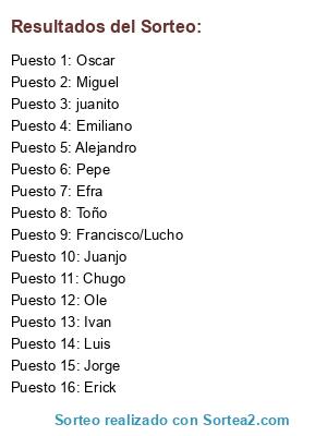 Lista de participantes: Miguel, Oscar, Emiliano, Ivan, Juanjo, juanito, Efra, Alejandro, Ole, Jorge, Chugo, Toño, Pepe, Francisco/Lucho, Luis, Erick.
