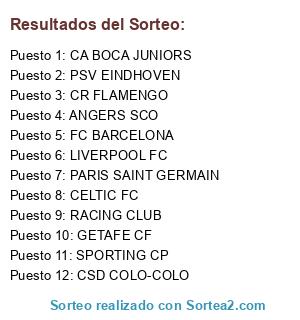 Lista de participantes: FC BARCELONA, CELTIC FC, GETAFE CF, SPORTING CP, PSV EINDHOVEN, RACING CLUB, CR FLAMENGO, CA BOCA JUNIORS, LIVERPOOL FC, ANGERS SCO, CSD COLO-COLO, PARIS SAINT GERMAIN.