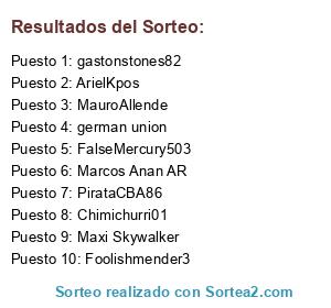 Lista de participantes: Gus787 , Maxi Skywalker, MauroAllende, Elvengador06, NachoCometto, Chimichurri01, Foolishmender3, ArielKpos, centurión 26 26, NachiitoGoopy, gastonstones82, pitertools76, Nico Ribas RNR, german union, Marcos Anan AR, FalseMercury503 , keetoa7x, PirataCBA86, Claudioxeneize, metutuby.