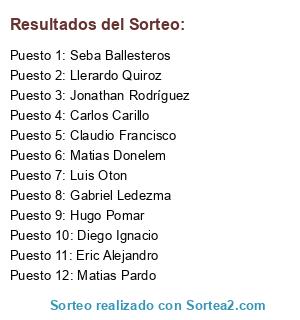 Lista de participantes: Hugo Pomar, Luis Oton, Carlos Carillo, Matias Donelem, Claudio Francisco, Eric Alejandro, Llerardo Quiroz, Diego Ignacio, Gabriel Ledezma, Seba Ballesteros, Jonathan Rodríguez, Matias Pardo.
