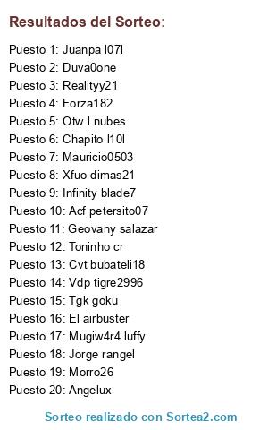 Lista de participantes: Mugiw4r4 luffy, Forza182, El airbuster, Realityy21, Cvt bubateli18, Duva0one, Vdp tigre2996, Juanpa l07l, Infinity blade7, Angelux, Acf petersito07, Toninho cr, Otw l nubes, Xfuo dimas21, Geovany salazar, Jorge rangel, Morro26, Tgk goku, Mauricio0503, Chapito l10l.