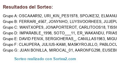 Lista de participantes: AARONFG298, CANILLAS1983, CARLITOOS18, CLAUPERA, DAVID FENIX, ELMANUE_15, ER_WAKANDU, EUSEBIO_14, FERRARI_4567, FRIAS_01, WANTXOPE9, IMPARABLE_1998, JONAPORTEROT, JONYNHO, JUAN BONILLA, JUJEPU, JULIUS-KAMI, LUYSVOORHEES, MASKYROJILLO, MIGUECHE, MIROCAL_01, OSCAAAR92, PABLOCUSAN, SERGIOHERAS_, SOTO___11, SPOJKE32, TISSOTMATIAS58, URI_KIN_PES1978.
