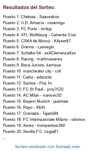 Lista de participantes: CSKA de Moscú - K4yser87, Schalke 04 - xxXClemenzaXxx, Racing - martincaceres, Shacktar Donestk - JJcrack10, AC Milan - ivanovic92, Sevilla F.C. Legia81, Boca Juniors- karrique, Chelsea - Saavexbox, Bayern Munich - jaaiimee, Santos - PioL1n, SSC Napoli - lvaan, Xerez - trompexbox360, Rayo - KloN, Los Yebenes - Adriantr127, Granada - Tajada94, FC Porto - mrtsgi, U.D. Almería - noianingu, Celta - javitr, manchester city - coll, Cadiz - adanzito, FC Internazionale Milano - celorios, VFL Wolfsburg - Calvente Civic, FC St Pauli - jony3120, Gremio - Lariosgin.