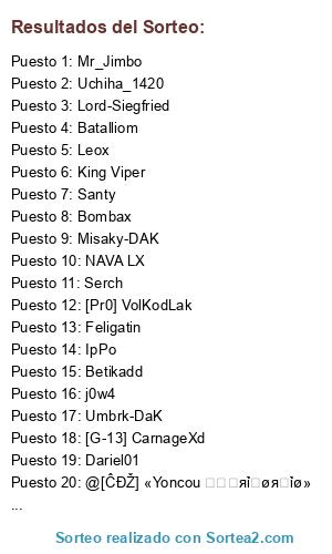 Lista de participantes: Leox, Aizen, Santy, Betikadd, j0w4, IpPo, @[ĈĐŽ] «Yoncou ₵ᾴṕяỉḉøяήỉø», Smerk G-13, Feligatin, [G-13] CarnageXd, NAVA LX, King Viper, Serch, OSO LX, [Pr0] VolKodLak, Master-kyo, Yugo, Mr_Jimbo, ~Sologeo [NX], Umbrk-DaK, Dariel01, DarkhackerS, Batalliom, jaiboso, Uchiha_1420, Misaky-DAK, Lord-Siegfried, Bombax.