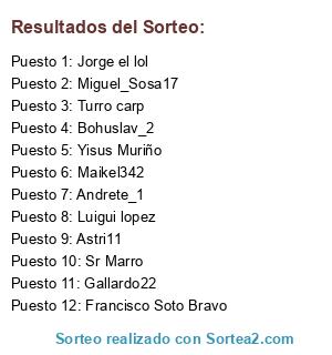 Lista de participantes: Gallardo22, Miguel_Sosa17, Astri11, Bohuslav_2, Sr Marro, Francisco Soto Bravo, Jorge el lol, Luigui lopez, Maikel342, Andrete_1, Turro carp, Yisus Muriño.