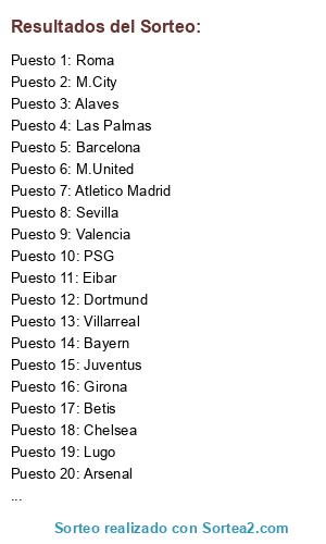 Lista de participantes: Panathinaikos, Real Madrid, Santos, Valencia, Arsenal, Real Betis, United, Sevilla, Sporting, Olympiakos, PSG, Watford, Juventus, Sunderland, Barsa, Cadiz, Aston Villa, Fulham.