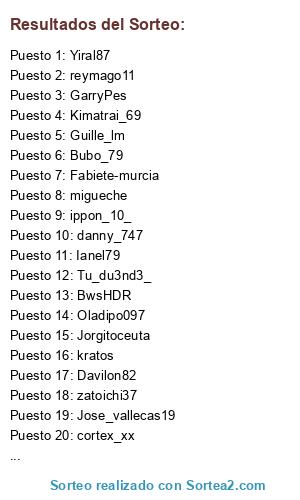 Lista de participantes: Tu_du3nd3_, Kimatrai_69, Ianel79, Jorgitoceuta, GarryPes, danny_747, reymago11, migueche, kratos, Oladipo097, Jose_vallecas19, Guille_lm, Bubo_79, Jorgelm7, cortex_xx, Davilon82, zatoichi37, Losadita7, Fabiete-murcia, ippon_10_, Manuwatagata, lexusxxv, Yiral87, BwsHDR.