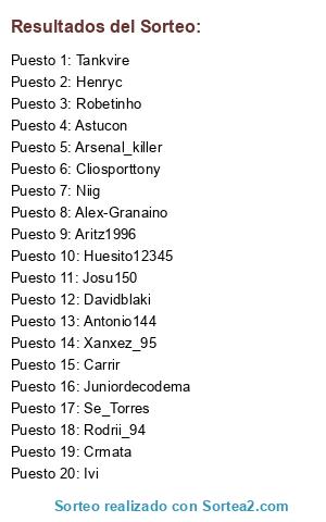 Lista de participantes: Alex-Granaino, Rodrii_94, Huesito12345, Aritz1996, Ivi, Niig, Robetinho, Crmata, Juniordecodema, Josu150, Antonio144, Davidblaki, Tankvire, Se_Torres, Cliosporttony, Xanxez_95, Henryc, Astucon, Carrir, Arsenal_killer.
