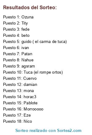 Lista de participantes: Pablote, Nico, Tity, Morrooooo, Ozuna, horac3, Eze, damian, fede, ivan, Nahue, Cuervo, agsram, mona, Tuca (el rompe ortos), beto, guido ( el carma de tuca), Patan.