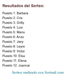 Lista de participantes: Cris, Elena, Barbara, Luis, Manu, Leyre, Anzu, Grilly, Victor, Juancar, Jeny, Elsa.
