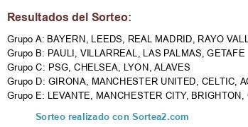 Lista de participantes: MANCHESTER UNITED, MANCHESTER CITY, VILLARREAL, LEEDS, LAS PALMAS, GIRONA, LYON, LEVANTE, BRIGHTON, GETAFE, PSG, AC MILAN, REAL MADRID, PAULI, OSASUNA, BAYERN, RAYO VALLECANO, CHELSEA, ALAVES, CELTIC.