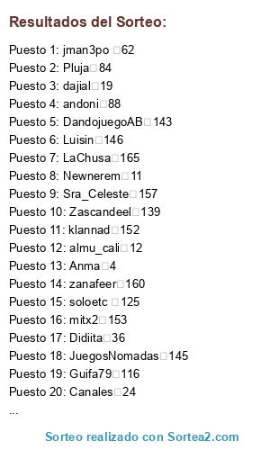 Lista de participantes: Adri 48, AdrianSeoane 167, almu_cali 12, andoni 88, Andula 164, Anma 4, Antheea 135, Avesan 91, bertus76 73, BRUNEM 39, Bryros19 156, byfed 109, Calvo 54, Canales 24, ccanado 96, Chacky54 158, chesirescat 42, corion 75, csibadajoz 69, dajial 19, DandojuegoAB 143, davicivad 100, davidjsanz 124, davimel 163, DÉBH 59, Didiita 36, El Heredero 41, Eris 20, Farrels 53, Feanor 97, ferchu 105, Ferris 66, Floppy 126, fueramiseria 58, Galarth 3, Garazgor 89, Garthan 90, gemagemita 25, Gemerlos 104, Gentilhombre 99, gepeto 47, gixmo 81, Gonzzy 55, Guifa79 116, Harishkah 7, HéctorDG 121, horak 131, Hydra 17, incredulo 45, IriaCires 166, IvanMoraleja 149, Ivee 51, jackdaniel 76, Jason 137, javibal 142, jblazquez 44, jbsiena 128, Jimena 26, jlnr762 144, jman3po 62, Jokin 83, Juarkonn 150, JuegosNomadas 145, JULIOCESAR 33, JUNI 61, kalamidad21 13, KaonToPion 29, klannad 152, korfu 118, Kurnous 31, Kurumir 50, LaChusa 165, Laister 32, Lovernios 35, Luis Javier 52, Luisin 146, Maeglor 6, MALAVENTURA 92, Maldorock 98, maltzur 93, mediliane 71, Mefis 40, Mencey 132, Miguelón 101, mitx2 153, moonnoise 151, Muchovicio 162, Murdockus 85, Nachomagic 64, Nata90 23, Nelly 119, Newnerem 11, Nova_55 141, OliverL 122, Orphebus 134, Paquisto 140, pardiez 154, Pez 115, Pluja 84, porghar 38, Pusyreichel 147, Queseyo 67, quin 112, Raxar 57, Reuner 1, Rosa Peral 155, soloetc 125, Sra_Celeste 157, Terpsichore 74, trasgu33 49, Truji 148, Vazkez_javi 87, Vickayfu 161, Vicky_213 8, viernesblanco 79, Wizzy 133, Wolrum 117, zanafeer 160, Zascandeel 139.