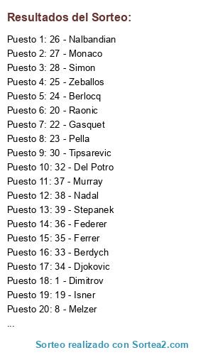 Lista de participantes: 1 - Dimitrov, 2 - Fish, 3 - Youzhny, 4 - Benneteau, 5 -Florian Mayer, 6 - Anderson, 7 - Klizan, 8 - Melzer, 9 - Janowicz, 10 - Chardy, 11 - Verdasco, 12 - Dolgopolov, 13 - Haas, 14 – Nishikori, 15 - Querrey, 16 - Kolschreiber, 17 - Wawrinka, 18 - Seppi, 19 - Isner, 20 - Raonic, 21 - Cilic, 22 - Gasquet, 23 - Pella, 24 - Berlocq, 25 - Zeballos, 26 - Nalbandian, 27 - Monaco, 28 - Simon, 29 – Tsonga, 30 - Tipsarevic, 32 - Del Potro, 33 - Berdych, 34 - Djokovic, 35 - Ferrer, 36 - Federer, 37 - Murray, 38 - Nadal, 39 - Stepanek.