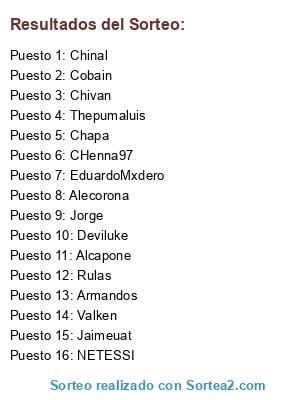 Lista de participantes: CHenna97, Chinal, Deviluke, Chapa, Cobain, Thepumaluis, Chivan, Alcapone, Armandos, Rulas, Valken, EduardoMxdero, Jaimeuat, Jorge, NETESSI, Alecorona.