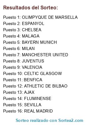 Lista de participantes: BAYERN MUNICH, BENFICA, CHELSEA, FLUMINENSE, SEVILLA, MANCHESTER UNITED, AJAX, JUVENTUS, REAL MADRID, MALAGA, OLIMPYQUE DE MARSELLA, ATHLETIC DE BILBAO, ESPANYOL, VALENCIA, MILAN, CELTIC GLASGOW.