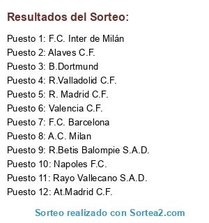 Lista de participantes: At.Madrid C.F., F.C. Barcelona, R.Betis Balompie S.A.D., Rayo Vallecano S.A.D., F.C. Inter de Milán, Napoles F.C., R. Madrid C.F., B.Dortmund, A.C. Milan, Valencia C.F., R.Valladolid C.F., Alaves C.F..