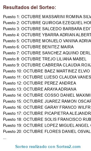 Lista de participantes: OCTUBRE ALEGRE JUAN ERNESTO, OCTUBRE ZAPPA ARIEL ALBERTO, OCTUBRE ALEJANDRO GLADYS BEATRIZ, OCTUBRE MAITA ANALIA, OCTUBRE MANSILLA MONICA MABEL, OCTUBRE JUAREZ RAMON OSCAR, OCTUBRE FIOR SILVIA, OCTUBRE GONZALEZ ALFREDO DANIEL, OCTUBRE SALTEÑO GRACIELA, OCTUBRE SOTO ROXANA ESTELA, OCTUBRE ORTIZ CUENCA ANGEL, OCTUBRE MONJELO VANINA ADRIANA, OCTUBRE MORENO LUCAS, OCTUBRE MASSARINI ROMINA SILVANA, OCTUBRE MARTINEZ SILVERIANO, OCTUBRE AROCHA ALICIA, OCTUBRE SANABRIA ESPINOZA TERECIO, OCTUBRE BENITEZ RODRIGUEZ RODOLFO, OCTUBRE QUIROGA EZEQUIEL HORACIO, OCTUBRE PERALTA ALEJANDRA, OCTUBRE RAMIREZ ARGENTINO GABRIEL, OCTUBRE GUILLEN ANGEL, OCTUBRE BUSCIGLIO NANCI GABRIELA, OCTUBRE MERCADO SANDRA, OCTUBRE ARANDA LORENA ITATI, OCTUBRE CABRERA IVAN GABRIEL, OCTUBRE GODOY SILVIA ADRIANA, OCTUBRE FERREYRA JORGE, OCTUBRE FANCHINI FERNANDO, OCTUBRE VILLAR CACERES CANDIDO, OCTUBRE VELAZQUEZ MARIA TERESA, OCTUBRE ACUÑA RAMON, OCTUBRE CABANILLAS MIRIAM VIVIANA, OCTUBRE CACERIO NANCI, OCTUBRE BRUNO SANDRA, OCTUBRE CASTAÑEDA VICTOR ARIEL, OCTUBRE BENEDETTO JUAN JOSE, OCTUBRE AREVALO QUINTIN, OCTUBRE ONTIVERO ANAHI ELIZABET, OCTUBRE GONZALEZ GISELA, OCTUBRE MARTINEZ LETICIA, OCTUBRE GOMEZ MATIAS SEBASTIAN, OCTUBRE ROTELA ARRUA FRANCISCO, OCTUBRE CORVALAN GONZALO DARIO, OCTUBRE LEZCANO GISELA MARIELA, OCTUBRE VELAZQUEZ JESICA, OCTUBRE VECCHIO MARIA CRISTINA, OCTUBRE GONZALEZ ALMIRON EMILCE, OCTUBRE PÀPARONI ROCIO ESTER, OCTUBRE VINCIGUERRA JOSE LUIS, OCTUBRE SARANITI LILIANA, OCTUBRE CASAL SUSANA RAMONA, OCTUBRE SOLIS FRANCISCO RUBEN, OCTUBRE CONTRERAS CINTIA LORENA, OCTUBRE VENTO RENE SEBASTIAN, OCTUBRE CASTRO LUCAS ROBERTO, OCTUBRE BAIZ ESTELA SUSANA, OCTUBRE BARRIOS SAMUDIO FRANCISCO, OCTUBRE LESCANO ANGELA FRANCISCA, OCTUBRE CASTRO MATIAS, OCTUBRE CORREA GISELA ANDREA, OCTUBRE CABRAL RAMON, OCTUBRE CUBAS MORA FRANCISCO, OCTUBRE VALENTE GASTON JOEL, OCTUBRE LOZA DANIEL EDUARDO, OCTUBRE ORTIZ CRISTALDO HECTOR, OCTUBRE GEREZ JUAN JULIAN, OCTUBRE FERNANDEZ HERNAN ARIEL, OCTUBRE CUBA VERA EGIDIO, OCTUBRE ASENSIO DANIEL ROLANDO, OCTUBRE ORTIZ GONZALO SEBASTIAN, OCTUBRE VERA GONZALEZ FIDELINO, OCTUBRE FRANCO NATALIA, OCTUBRE SACCHI EMANUEL, OCTUBRE BARRETO VERA ATILANO, OCTUBRE FERNANDEZ ADRIAN, OCTUBRE IBAÑEZ JUAN CARLOS, OCTUBRE MENGA ADRIANA, OCTUBRE ZAMUDIO NILDA MARIELA, OCTUBRE DEFEO NELSON FABIAN, OCTUBRE LENCINAS FRANCISCO ERNESTO, OCTUBRE LEGUIZAMON RAMON GREGORIO, OCTUBRE CASTO CRESPO JORGE LUIS, OCTUBRE AGUAYO BALMACEDA ANTONIO, OCTUBRE GONZALEZ DIEGO FABIAN, OCTUBRE SALCEDO BARBARA EDITH, OCTUBRE RAMIREZ ROSARIO DEL CARMEN, OCTUBRE PENIDA NELSON RUBEN, OCTUBRE PASTORINI CARLOS, OCTUBRE GIOSA LUCIANO PAOLO, OCTUBRE ARANDA RICARDO, OCTUBRE ROMERO CRISTIAN, OCTUBRE RAMIREZ MAURICIO, OCTUBRE MARTINEZ LUCIANA, OCTUBRE BAEZ MARTINEZ ELVIO, OCTUBRE BAEZ MARTINEZ GILBERTO, OCTUBRE CASTILLO GONZALEZ MIGUEL, OCTUBRE MARTINEZ ALBERTO MANUEL, OCTUBRE NARDI FABIANA MARIA, OCTUBRE BUZZI GRACIELA, OCTUBRE MILANO OSCAR LUIS, OCTUBRE BAY JORGE FRANCISCO, OCTUBRE GONZALEZ LORENA, OCTUBRE ZARZUR CRISTIAN ANDRES, OCTUBRE SANCHEZ BAEZ DEOLINDA, OCTUBRE GOMEZ ROMINA, OCTUBRE ARNOLFO DANIEL RUBEN, OCTUBRE GRANT LILIANA LAURA, OCTUBRE ALACANO EDUARDO, OCTUBRE VALLEJOS OMAR LUIS, OCTUBRE LOPEZ NORMA, OCTUBRE HERRERA MONICA, OCTUBRE PEREZ ANDREA, OCTUBRE MORALES MARCELA, OCTUBRE BIE NANCY CORINA, OCTUBRE ORTIZ HORACIO OMAR, OCTUBRE ENRIQUE JOSE LUIS, OCTUBRE ESCALADA ALEJANDRO}, OCTUBRE SOSA YAMILA BELEN, OCTUBRE FOLK GISELA BEATRIZ, OCTUBRE SPEDALE MONICA, OCTUBRE TREJO LILIANA MABEL, OCTUBRE BARRETO JORGE, OCTUBRE BISGARRA LUIS, OCTUBRE ESPINOSA GABRIELA, OCTUBRE SOLIS CRISTIAN ISMAEL, OCTUBRE BUSSETTI MAURICIO, OCTUBRE MONTIVERO LUCIANO DAMIAN, OCTUBRE DIAZ YANINA VANESA, OCTUBRE RICCI GONZALO HUGO, OCTUBRE MARTINEZ NELSON RAMON, OCTUBRE ORTIGALA RODRIGO, OCTUBRE CARDOZO CRISANTO ANTONIO, OCTUBRE CHAMORRO CABRERA EVER HUGO, OCTUBRE ESPINOSA PABLO EDUARDO, OCTUBRE ACEVEDO JUAN, OCTUBRE ROMERO MARTINEZ JESICA NATALIA, OCTUBRE CORDOBA HECTOR, OCTUBRE SIR ANA MARIA, OCTUBRE ACENSIO ROSA, OCTUBRE GARCIA NELSON, OCTUBRE MARTINEZ VIRGINIA MA DE LUJAN, OCTUBRE VILLALBA PABLO GUSTAVO, OCTUBRE CAMBIASO PAULA, OCTUBRE RODRIGUEZ VERONICA GABRIELA, OCTUBRE DI VANNI SEBASTIAN, OCTUBRE BARRIENTOS ERMELINDA, OCTUBRE VEGAS GODOY ANGEL DANIEL, OCTUBRE BREST RUBEN ALBERTO, OCTUBRE JUAREZ IRIS LILIANA, OCTUBRE VELEZ GUSTAVO ADOLFO, OCTUBRE LOPEZ MIGUEL ANGEL OSCAR, OCTUBRE BOYER ANDREA, OCTUBRE SANCHEZ RICARDO ALEJANDRI, OCTUBRE MARCIANIS ANTONIO J NAZARENO, OCTUBRE ROCA ANDREA, OCTUBRE GOMEZ CARLOS LITO, OCTUBRE ALZOGARAY NORMA PATRICIA, OCTUBRE GONZALEZ TERESA DE JESUS, OCTUBRE FLORES DANIEL OSVALDO, OCTUBRE ARAYA ADRIANA, OCTUBRE PICAPIETRA ALEJANDRA, OCTUBRE MORIN JUAN MARCELO, OCTUBRE ELSE MARIANA, OCTUBRE MIRANDA CLAUDIO, OCTUBRE GONZALEZ ORLANDO, OCTUBRE DAVALOS SEGOVIA HECTOR, OCTUBRE CARDONA ROSA DEL CARMEN, OCTUBRE SAPPIETRO NESTOR RUBEN, OCTUBRE BAEZ ESTELVINA, OCTUBRE LUESO CLAUDIA VANESA, OCTUBRE AROCA LUCAS ANDRES, OCTUBRE SALVATIERRA JANINA NOEMI, OCTUBRE VITABILE EVELYN, OCTUBRE BSUTOS GIULIANA, OCTUBRE GONZALEZ RUIZ DIAZ LILIANA, OCTUBRE AHUMADA WALTER, OCTUBRE AMAYA LUCIA EDITH, OCTUBRE BATALLA MARCELA, OCTUBRE CARDOZO CARINA ANDREA, OCTUBRE GALVEZ MIGUEL ANGEL, OCTUBRE ESPINOZA LUCIANO, OCTUBRE BAEZ ADELA, OCTUBRE BARRETO VIRGINIA SOLEDAD, OCTUBRE LUNA VANESA SOLEDAD, OCTUBRE SOSA ELIZABETH BEATRIZ, OCTUBRE ACOSTA LEANDRO, OCTUBRE OVANDO OSCAR OSVALDO, OCTUBRE GOROSITO DANIELA ALEJANDRA, OCTUBRE OJEDA ROCA GUILLERMA, OCTUBRE ESTIGARRIBIA JORGELINA BEATRIZ, OCTUBRE ARANDA ERNESTO, OCTUBRE HERRERA JACINTA ANGELICA, OCTUBRE LANZIANI CARLA, OCTUBRE BALLEJOS ELISABET, OCTUBRE LINCHE ADRIAN EMANUEL, OCTUBRE CORONEL EMANUEL CARLOS, OCTUBRE VILLALBA ANABEL VANESA, OCTUBRE EVELYN BEATRIZ, OCTUBRE NAVARRO CLAUDIO ANTONIO, OCTUBRE TORRES MARIN DERLIS, OCTUBRE CASANOVA JOSE ALBERTO, OCTUBRE NOVARESE IVANA SILVIA, OCTUBRE BENAVIDEZ RAUL ORLANDO, OCTUBRE RODRIGUEZ ALIDE, OCTUBRE MARTINEZ ANIBAL, OCTUBRE GOMEZ A