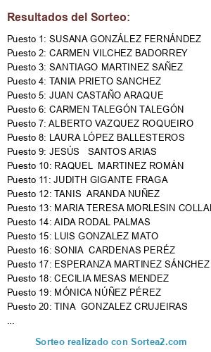 Lista de participantes: SILVIA TAMAYO MARTINEZ, JULIAN DEL RIO SILVA, MARIA GARCIA CAMPOS, JULIAN DEL RIO MANGAS, BELÉN MANGAS CEINOS, ANA BELÉN DEL RIO MANGAS, MANUEL CALVIÑO MOLEDO, JULIAN LOPEZ ARRIBAS, NOELIA MAESTROS POSADAS, MIGUEL ANGEL MARTINEZ MORA, Mª TERESA ZURDO GONZALEZ, CONCHA MARTINEZ PIÑEIRO, JESÚS IGNACIO SANCHEZ GARCIA, RODRIGO INGELMO TEJO, NEREA TORRES ELIZBURU, MARIETEL FENANDEZ FERNANDEZ, YOLANDA CAUTERO BLANCO, ANA PEREZ RODRIGUEZ, JUAN SANCHEZ VEAS, VIRGINIA GARRIDO PINTO, PATRICIA PRIETO VÁZQUEZ, CARMEN VÁZQUEZ IGLESIAS, LOIDA GARRIDO PINTO, ARIADNA MONTER FERNÁNDEZ, CRISTINA SANCHEZ VILLA, Mª JESUS ROMERO ESCALONA, SONIA NAVARRO DOMINGUEZ, JOSEFA MORENO GARCIA- VALENCIANO, MARTA MADRID JUANES, RAQUEL CAMPOS CARAMES, MARIA DEL PILAR MARTINEZ PIÑEIRO, PATRICIA DIEZ DE LA PEÑA, DOLORES JIMENEZ TORRES, OLGA GONZALEZ CENTENO, ANTONIO GOMEZ FERNANDEZ, OIHANE BALLESTERO DIEZ, LEIRE BALLESTERO DIEZ, BEATRIZ SÁNCHEZ REPISO, JOSE MANUEL LÓPEZ GARCÍA, NEREA FERRO GONZALEZ, OLAIA APARICIO BARRANCO, CRISTINA MIRANDA ARROYO, SILVIA CALAVIA BELLOC, SONIA CARDENAS PERÉZ, JULIA CAPEZAS PRIETO, EIROA CARMELO CARCIA, MARIA JESÚS DE LA IGLESIA TURIÑO, MARTA PEREÑA MANTILLA, PILAR CABRÉ RUBIO, RAFAEL TITO VAZQUEZ ROMERO, BEATRIZ DE LEÓN MIGUEL, ISABEL RAMIREZ GOMEZ, JOSE VAZQUEZ IGLESIAS, MARIA CASANOVAS MONTES, MARIA ARCOS CEBREIRO, BELEN POZA MARTÍN, ASCENSIÓN GANGO ANDALUZ, IVÁN DE PABLO CARRIL ALDREY, LORENA LAGUNA GONZALEZ, MIKEL MATEOS, VANESSA MARTIN MORENO, MILA MORGA TORRALBA, SUSANA GONZÁLEZ FERNÁNDEZ, DAVID PERÉZ GARCÍA, MERCEDES MIGUEL FERNÁNDEZ, JOSE Mª PERÉZ SUAREZ, NATÁN RODRÍGUEZ CAMARERO, SOFÍA LUIS ALONSO, SILVIA PARDO VILLA, VIRGINIA MUÑOZ TEJERO, LAURA ALONSO TALEGÓN, MONTSERRAT REPISO FONBELLIDA, JUAN CARLOS REBOLLO HERRERA, LAURA AZOCAS GONZÁLEZ, ALBERTO IRASTORZA ALVAREZ, CONCEPCIÓN PINEDA GUERRERO, CARIDAD MAESO MOZO, JOSE LÓPEZ GONZÁLEZ, RAÚL GARCIA CALDERÓN, JAVIER MARTÍN ALONSO, ANA JUARNOS HUERGA, FERNANDO VILLAMOR GARCÍA, ROSA VACECILLOS ROMERO, MARINA SANS FERNÁNDEZ, JOSE MANUEL NOVEGIL GIL, ALBA BARREIRO CARBALLO, ANTONIA CRESPÍN MUDARRA, ALFREDO REINA MORENO, ALLENDE RODRIGUEZ RUBIO, AINTZANE HERNANDEZ, CAROLINA BUCETA RESURRECIÓN, Mª JOSÉ TORRES SOLLEIRO, MAYTE LAFRAYA JIMENEZ, DANIEL JIMENEZ BLANCO, OSCAR MACIAS, MARIA ELIZBURU DURAN, JOSE ANTONIO ESPADA, ERIKA TAVARES, MARIA DE LA CRUZ GARCIA- VALENCIANO RUIZ, Mª DEL MAR ARROYO JIMENEZ, MERCEDES ALVAREZ HERNANDEZ, CRISTINA GONZÁLEZ PEÑIN, MªTERESA MAESO MOZO, EGUSKIÑE FERNADEZ MARQUEZ, KIÑE FERNADEZ MARQUEZ, ISABEL HERRERO RUPEREZ, ENCARNA HERRERO RUPEREZ, CARMEN FERNADEZ GUINDEL, Mª CARMEN ESPADA FERNANDEZ, Mª ANGELES SOLANO FERNANDEZ, ROCIO PERÉZ GARCÍA, SANTIAGO MARTINEZ SAÑEZ, Mª LUZ MUÑOZ HERRERO, MARIA CORRECHER RICO, MARTIN FERNANDEZ DE HEYES, FEDERICO SANCHEZ GARCIA, JOSE LUIS PERÉZ MARTIN, DANIEL FUENTES DE LEÓN, JUAN CARLOS FERNANDEZ, CARMEN VILCHEZ BADORREY, ZULEMA GONZÁLEZ PRIETO, JOSE LUIS RODAL SEIJO, CLARA PALMAS GONZALEZ, EVA MILA GARCIA, MªDEL CARMEN BARROS CASTELO, MIGUEL ANGEL REGUEIRAS VELASCO, DANIEL RAMIREZ GOMEZ, BRAIS CARBALLES DÍAZ, CARLOS LUIS NOGALES DOMINGUEZ, TANIA PRIETO SANCHEZ, MARIA DEL PILAR PERNAS LADRA, ANA MUÑOZ VELA, ERIKA SAIZ GARCIA, CARLOS ACUÑA, IRATXE FERNÁNDEZ OLASKOAGA, MÓNICA BUIL ARNAL, MONTSERRAT SANCHEZ REPISO, ARACELI GUILLÓ MÁS, BERTA CARRETERO BRIONES, DANI AZPIRI IBARS, PEDRO JESÚS ULLOTE MARTINEZ DE LAPUNENTE, JAVIER DIAZ MATOS, DAVID DELGADO FIGUERAS, DIEGO CANDÁN SUAREZ, PEDRO RODRIGUEZ HERNANDEZ, MÓNICA MARIÑO FERNANDEZ, MARIA JOSE FERNANDEZ MARIÑO, LUCIA MARIÑO FERNANDEZ, ANTONIO IZQUIERDO NAVARRO, ALEJANDRO CALDERO CONDE, VANESSA MORGA TORRALBA, ANA TESÓN REPRESA, JOSE CARLOS MARTINÉZ ALONSO, SONIA CADENAS PERÉZ, PAULA MARTINEZ ALONSO, RUBÉN BAZ MARTINEZ, LAURA MOLINA VERDES, VANESA CHAMIZO MORENO, XOSE MANUEL FARESIA BARRERO, MANUEL LUIS SOMOZA HERNO, NURIA MARIÑO ESTEVEZ, GEMA MOZÓN CRISTOBAL, FRANCISCA PINTO GARRIDO, MÓNICA ALONSO CIUIDANES, ANGELA CHAMIZO CASTILLA, MARCOS FERNÁNDEZ DE HAYA, VERONICA RODRIGUEZ CORONA, RUT LERMA DE OBESO, FRANCISCO JAVIER ACEBES MARTÍN, CARMEN VALCARCE LORENZO, CARLOS RÍO ECHEVARRIA, LUCIANO RODRIGUEZ TORBIO, BEATRIZ BOLZOMI ORTEGA, MIRIAN VELARDE DIEGUEZ, MARIA FIGUERAS GIL, JOSÉ MARTINEZ LÓPEZ, PAULA ACEBES MUÑOZ, PILAR RUBIO EMBID, IRATXE FERNANDEZ OLASKOAGA, MAITE GARCIA CARABIAS, JOSE FRANCISCO MORLESIN COLLADO, FERNANDO SANCHEZ MAUJORRES, MARA FERNANDEZ DE HOYOS, SARA PALACIOS MARTÍN, EVA PUELLES MESAS, EVA MARIA CAMPOS GONZALEZ, EVA EDO GOMEZ, JAVIER BLANCO HERRERO, AITZIBER MARTINEZ GARCIA, VICTOR PIZARRO ESTEVEZ, MARIMAR CONTE MENENDEZ, CRITIAN PIZARRO CONTE, DAVID PIZARRO CONTE, JOSE ANTONIO LUNA CEMBRANOS, LETICIA FERNÁNDEZ MARIÑO, NATALIA HERREROS LACALLE, MARIA CHELO MARIÑO CAMPOS, GUADALUPE VIDAL GONZALEZ, CARMELA ARCHILLA FRAGUEIRO, FELIX VILLAFOÑE SAN PABLO, RAQUEL CARDENAS PERÉZ, RUBEN FERNANDEZ ORTIZ, RODRIGO DE HOYOS ARCE, FRANCISCO JAVIER PALMA GARCIA, RAUL ACEBES MUÑOZ, MARIA NIEVES ESPINOSA RUIZ, Mª JOSE QUINZA, Mª DEL MAR ESPINOSA POMAR, MIGUEL DELLGADO ESCAMILLA, JORGE RABAÑAL REY, Mª JOSE ALONSO ALONSO CIRINDOMES, CRISTINA SOLANO ALONSO, MARCIAL MORETA NIN, VANESSA CAMPANO BENITO, ELISABETH GARCIA ORTUÑO, DAVID MARTINEZ PAVON, HERMINIA CABANILLAS GARCIA, Mª ÁNGELES POZO FERNANDEZ, SONIA VILLA BRAVO, FRANCISCO JOSE MONENTE MOAZ, INÉS MUÑOZ SUERO, FERNANDO BARCIELA PEREZ, SARAY ESPINOSA CIRBIAN, PILAR COSGAYA GARCÍA, SILVIA CRISTINA, FRANCISCO CAMACHO MIGUARUELO, MARIA NONSO TRUEBA, BEATRIZ GOMEZ BLANCO, PEDRO PINTO GARRIDO, ANA MARIA MARTINEZ LORENTE, MARIA ISABEL HUARTE GONZALEZ, ANTONIA CABANILLAS, MANUEL LABRADOS MORENO, DANIEL IZQUIERDO SAIZ, JOSE JULIAN MARTINEZ LORENTE, JESÚS SANTOS ARIAS, DAVID GARCIA DE HOYOS, MARIA DEL CARMEN HERMO ALVAREZ, NATIVIDAD MATILLA MOSQUERA, Mª ROSARIO FRAILE PESQUERA, IÑAKI PARRAR DONOSO, MARIANO LAGUNA CRIADO, RICARDO SAIZ GARCIA, LID