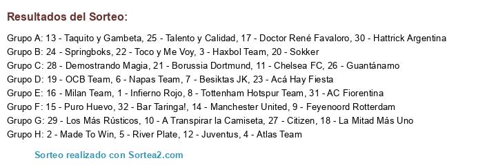 Lista de participantes: 1 - Infierno Rojo, 2 - Made To Win, 3 - Haxbol Team, 4 - Atlas Team, 5 - River Plate, 6 - Napas Team, 7 - Besiktas JK, 8 - Tottenham Hotspur Team, 9 - Feyenoord Rotterdam, 10 - A Transpirar la Camiseta, 11 - Chelsea FC, 12 - Juventus, 13 - Taquito y Gambeta, 14 - Manchester United, 15 - Puro Huevo, 16 - Milan Team, 17 - Doctor René Favaloro, 18 - La Mitad Más Uno, 19 - OCB Team, 20 - Sokker, 21 - Borussia Dortmund, 22 - Toco y Me Voy, 23 - Acá Hay Fiesta, 24 - Springboks, 25 - Talento y Calidad, 26 - Guantánamo, 27 - Citizen, 28 - Demostrando Magia, 29 - Los Más Rústicos, 30 - Hattrick Argentina, 31 - AC Fiorentina, 32 - Bar Taringa!.