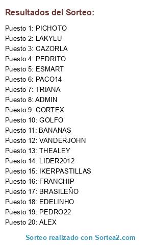 Lista de participantes: ADMIN, PACO14, PEDRO22, CORTEX, IKERPASTILLAS, TRIANA, LIDER2012, BRASILEÑO, ALEX, LAKYLU, PICHOTO, GOLFO, ESMART, PEDRITO, BANANAS, CAZORLA, FRANCHIP, VANDERJOHN, EDELINHO, THEALEY.