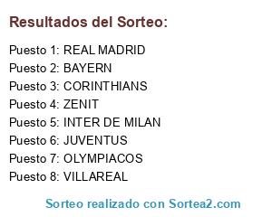 Lista de participantes: OLYMPIACOS, VILLAREAL, REAL MADRID, ZENIT, BAYERN, JUVENTUS, INTER DE MILAN, CORINTHIANS.