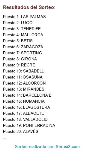Lista de participantes: MIRANDÉS, ALAVÉS, RECRE, VALLADOLID, GIRONA, ALBACETE, BETIS, LUGO, LAS PALMAS, NUMANCIA, LLAGOSTERA, ALCORCÓN, MALLORCA, OSASUNA, ZARAGOZA, TENERIFE, SABADELL, PONFERRADINA, BARCELONA B, SPORTING, RACING, CÓRDOVA.
