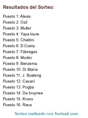 Lista de participantes: J. Boateng, Kroos, Modric, Ozil, Fábregas, Chiellini, Yaya toure, Pogba, De bruynee, Muller, Reus, Alexis, D.Costa, Benzema, Di María, Cavani.