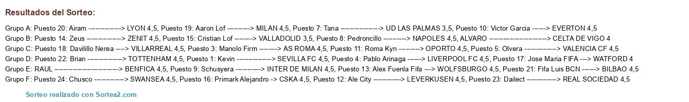 Lista de participantes: Puesto 1: Kevin ---------------> SEVILLA FC 4,5, Puesto 3: Manolo Firm --------> AS ROMA 4,5, Puesto 4: Pablo Arinaga ------> LIVERPOOL FC 4,5, Puesto 5: Olvera --------------> VALENCIA CF 4,5, Puesto 7: Tana -----------------> UD LAS PALMAS 3,5, Puesto 8: Pedroncillo ----------> NAPOLES 4,5, Puesto 9: Schusyera -----------> INTER DE MILAN 4,5, Puesto 10: Victor Garcia ------> EVERTON 4,5, Puesto 11: Roma Kyn ---------> OPORTO 4,5, Puesto 12: Ale City ------------> LEVERKUSEN 4,5, Puesto 13: Alex Fuenla Fifa ---> WOLFSBURGO 4,5, Puesto 14: Zeus ---------------> ZENIT 4,5, Puesto 15: Cristian Lof --------> VALLADOLID 3,5, Puesto 16: Primark Alejandro -> CSKA 4,5, Puesto 17: Jose Maria FIFA ---> WATFORD 4, Puesto 18: Davilillo Nerea ----> VILLARREAL 4,5, Puesto 19: Aaron Lof ----------> MILAN 4,5, Puesto 20: Airam --------------> LYON 4,5, Puesto 21: Fifa Luis BCN ------> BILBAO 4,5, Puesto 22: Brian ---------------> TOTTENHAM 4,5, Puesto 23: Dailect -------------> REAL SOCIEDAD 4,5, Puesto 24: Chusco -------------> SWANSEA 4,5, RAUL ----------------------------> BENFICA 4,5, ALVARO -------------------------> CELTA DE VIGO 4.
