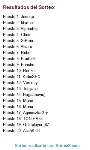 Lista de participantes: Marie, Renko, Versetty, Rober, Frincho, Garciii, Chris, Frade04, Bomba Navarro, Tonijaca, Sergioducar8, Alphadog, Manu, KobeSFC, Caniggia 22, AllanKidd, SrPeni, Alvaro, joseruz27, corrup, fitynho, Alvthebest, Goldplayer_87, mherlim, AgnieszkaGry, TONIHA83, Zztop, Bogdanovic), Joseqp, Rigoreau.