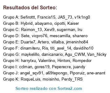 Lista de participantes: Sete, Van_Nicky, titi_axel_14, Perdy_TRS, Raimon_13, moisinho, danicanario, dinamiteru, cclman, Duarte7, Ris, Artero, Francis15, juandy, JAS_73, maykelillo, gores19, Xevi9, RoqueLuis, villalba, Hintoni, Piporuiz, Kaiser, Rompedor, harrytxu, Valentino, Hybrid, davidiho10, Agu_CWM, mescamilla, angel_sqv91, a69tepongo, cipotti, Iru, shanero, ane-anant, Peperecre, Sefirottt, v1k1ng0, sugerman, abayamo, jimeninho84, vicpro76.